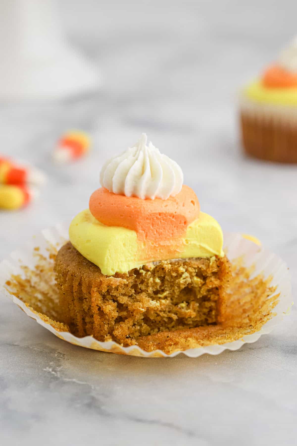 - Pumpkin Cupcakes with Candy Corn Buttercream